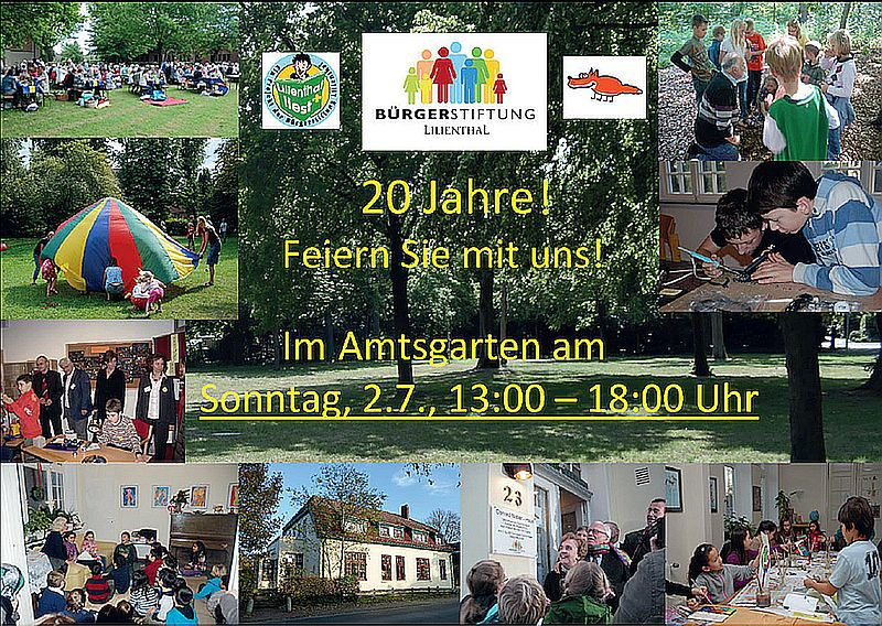 Am 2. Juli 2023 feiern wir im Amtsgarten von 13 bis 18 Uhr das 20jährige Jubiläum unserer Bürgerstiftung. Es gibt Getränke und Kuchen, feine Musik, Spiel- und Bastelaktionen für Kinder sowie Angebote von KaLi-Schlaufuchs zum Forschen und Experimentieren.